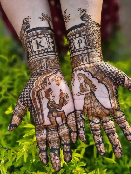 Custom Storytelling Designs - Love making personalized bridal mehendi - add portraits, names, dates, or special messages in your design.