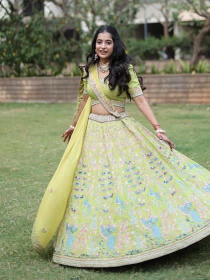 Shine bright at your pre-wedding functions with my collection of colorful outfits. I have a variety of lehengas and Indo-Western wear in shades of yellow, green, and multi-color prints, perfect for a lively Haldi or Mehndi ceremony.