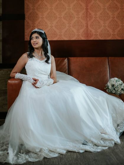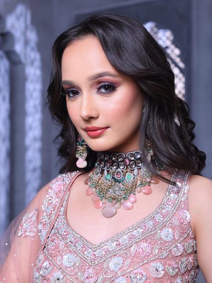 For the grand finale of your wedding celebrations, we create sophisticated and glamorous reception looks. Whether you envision soft, romantic waves or a chic updo, we pair it with flawless, long-lasting makeup. This gallery showcases a range of styles, from modern gowns to elegant lehengas, all designed to make you feel like a star.