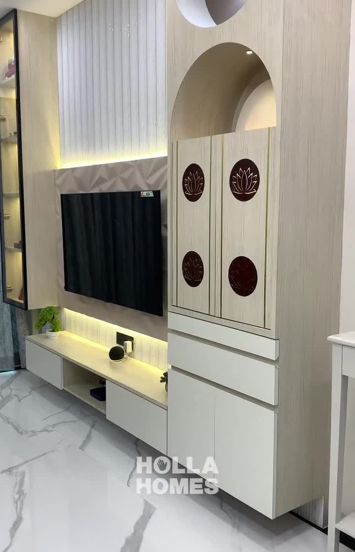 I specialize in creating beautiful pooja units that fit perfectly into city apartments. See how I integrate serene mandirs into TV units, wardrobes, or compact niches, saving space without compromising on devotion. These designs feature custom storage and elegant finishes.