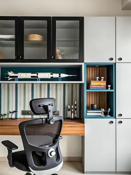 - Workstation: Linear or L-shaped study desk integrated with bookshelf or wardrobe side-panel.