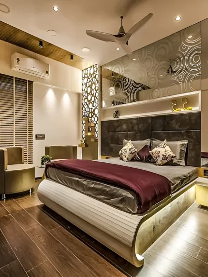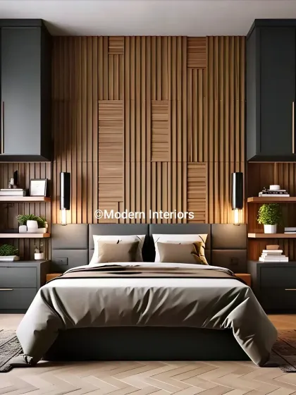 - Wall Paneling: Bed-back accent wall featuring WPC louvers, fluted panels, or PVC marble sheets.