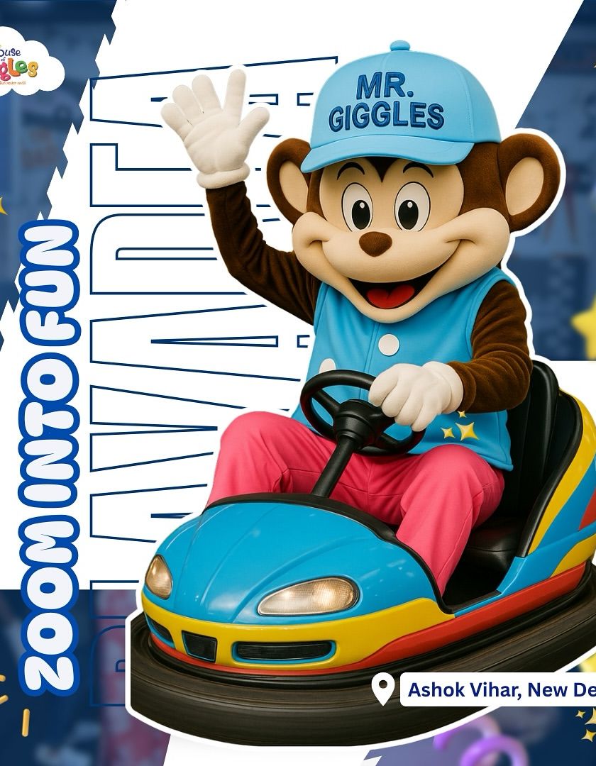 This is the first thing parents and kids see, a whirlwind of the joy and excitement that awaits. I've selected our most vibrant and action-packed visuals to capture the energy of House of Giggles, starting with our hero, Mr. Giggles, leading the fun. This collection shows the variety of experiences we offer, from thrilling parties and happy parent reviews to our special programs for the little ones.