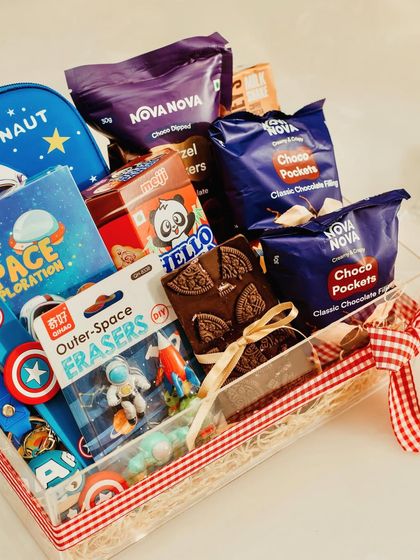 I design custom gift hampers that match the vibe of whoever’s receiving them. Kids go crazy for my Space or Unicorn themes, loaded with cute stationery and treats. For grown-ups, there’s everything from a ’90s Nostalgia box (think Kismi, Fatafat, Nutties) to spa kits, healthy munchies, and whiskey hampers. If you want something totally different, I can do that too.
