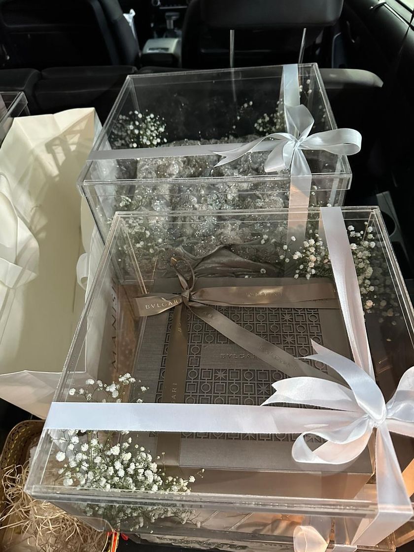 Your bridal trousseau deserves to be presented with as much care as it was chosen. We create custom packaging using elegant acrylic boxes, delicate florals, and satin ribbons to make unboxing your wedding outfits and accessories a truly special experience.