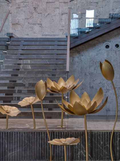 With a background in architecture but a heart full of stories, we use anything from metal, wood, plaster, to fabric - each one is just a tool for telling a tale. Sometimes we twist Mild Steel into huge, serene faces or turn marble floors into gardens with golden lotuses. Our artistic architectural partitions like ‘Cosmic Disco’ can split up a space without making it feel boxed in.