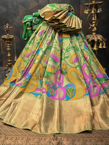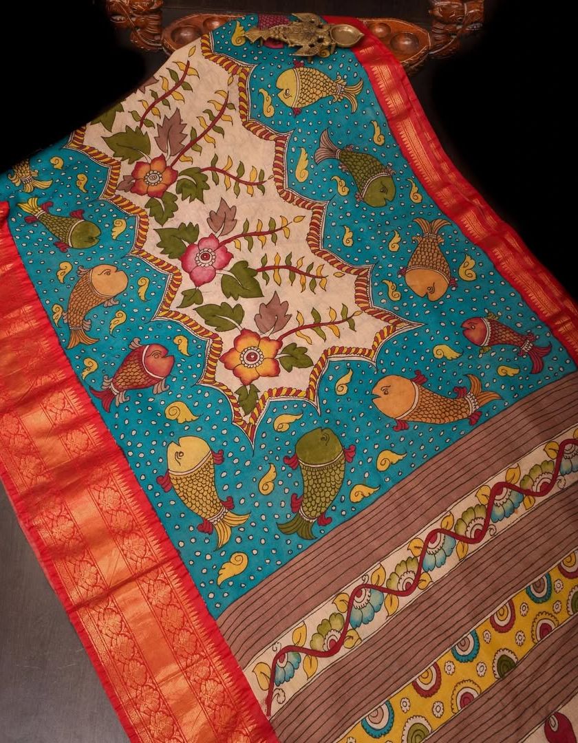 Each saree and blouse in this collection is a canvas, hand-painted by skilled artisans using the traditional Pen Kalamkari technique. I work directly with these artists to bring you authentic pieces that tell stories of mythology and nature, using only natural dyes. Owning one is like owning a piece of heritage.