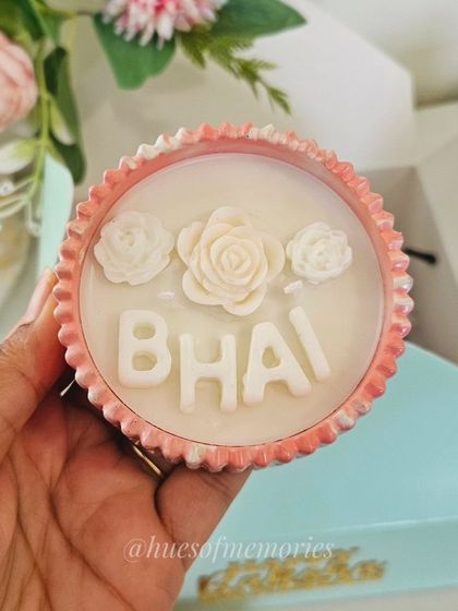 I create eco-friendly soy wax candles in various shapes including hexagon and scalloped edge designs. Each piece is handcrafted with decorative elements like floral designs, rose quartz crystals, and rose petals. My candles come in 10 different fragrances and can be customized in color and scent.