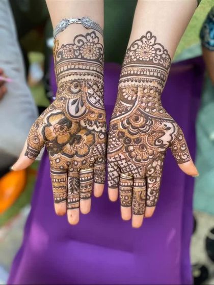 For guests who want a grand and memorable look, I create detailed full-hand and full-arm mehendi with my complete `junoon`. These designs are filled with traditional motifs like paisleys, florals, and jaali net-work, ensuring you feel just as special as the bride.