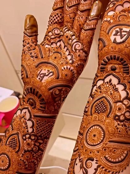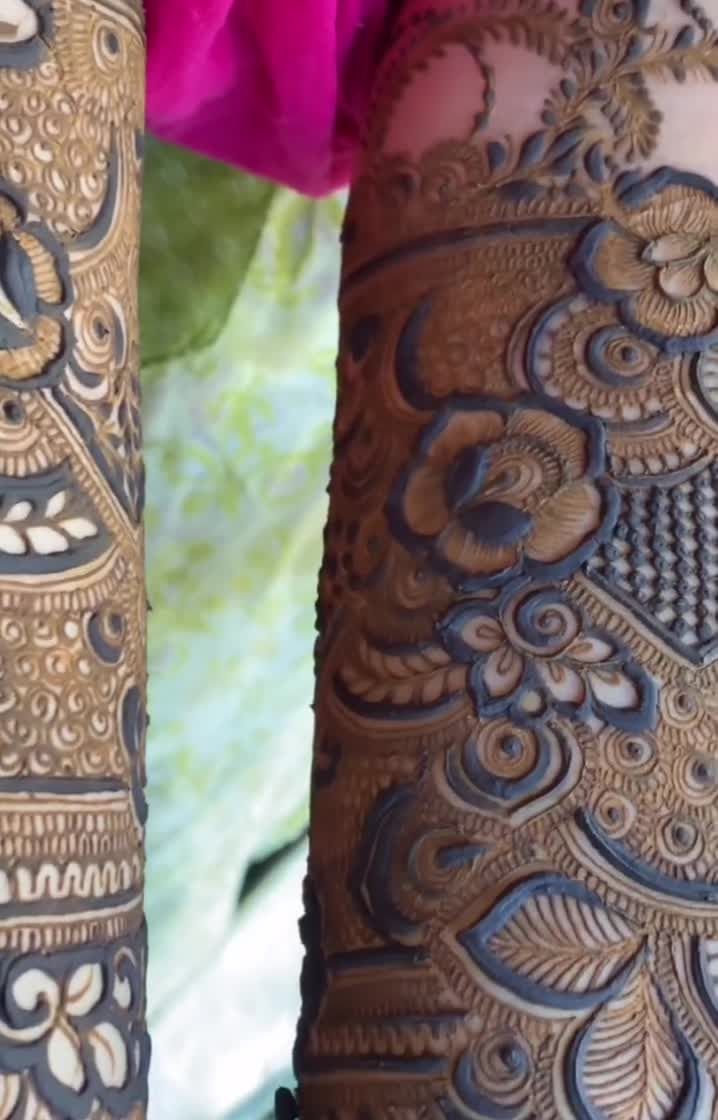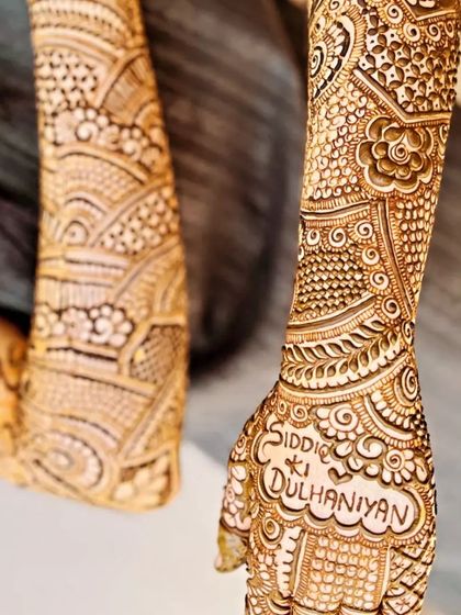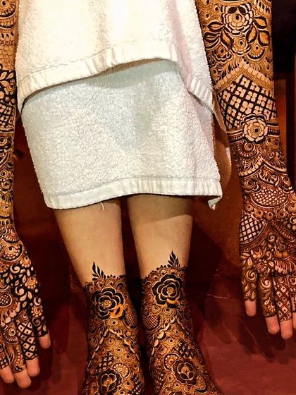 We love creating classic, dense mehendi patterns filled with detail. This includes traditional motifs like florals, paisleys, peacocks, and heavy latticework, applied from hands to elbows for a rich bridal look.