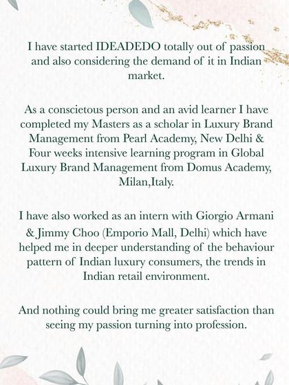 Hey, I’m the one my friends call before they buy anything, always the taste-maker. During those endless COVID days, I finally launched IDEADEDO, thanks to all that nudging from my folks. Studied luxury brands at Pearl and Italy, worked with Armani and Jimmy Choo, so I know the ins and outs of what makes style tick here. I believe in 'Lokah Samastah Sukhino Bhavantu'—helping people feel happy expressing themselves. This isn’t just work for me, it’s my way to spread joy.