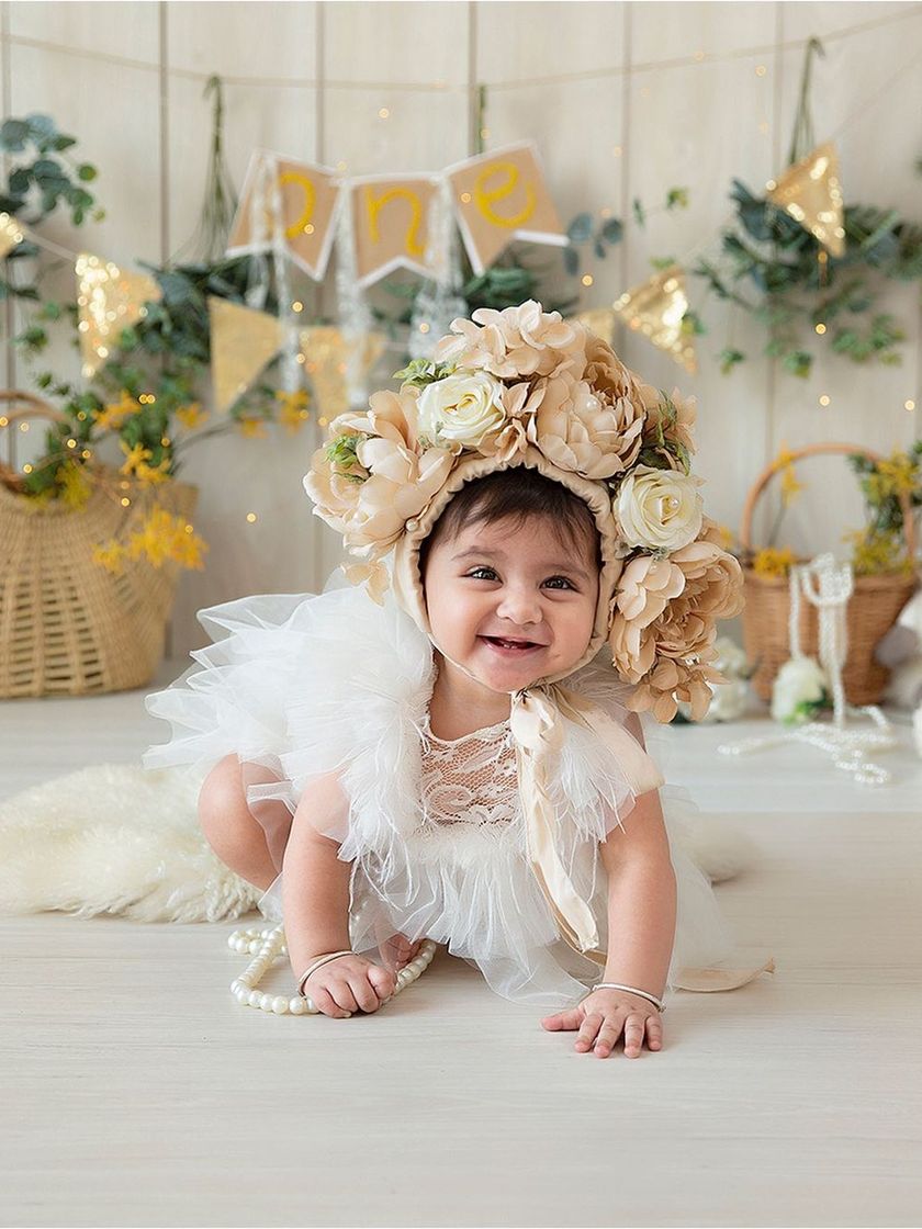 This is my collection of adorable, handmade wearable accessories for babies. You'll find a variety of items including large statement floral bonnets, cute animal-ear hats, and delicate floral headbands suitable for newborns and sitters.