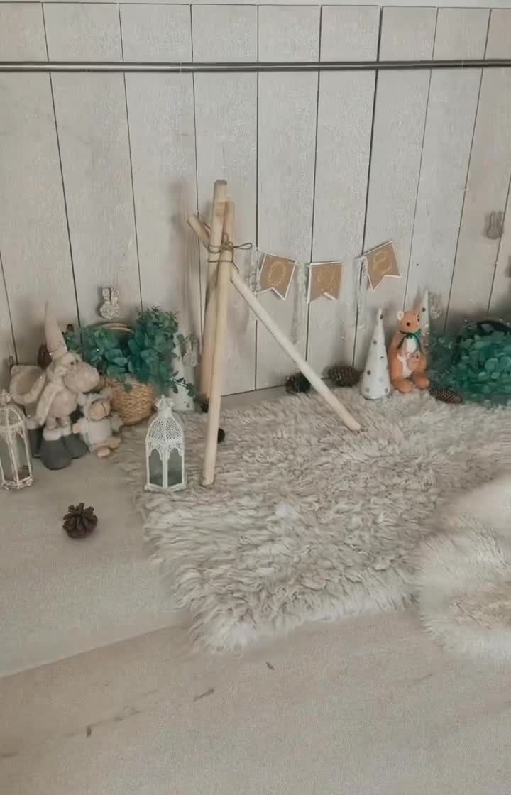Here you can find a range of gently used backdrops, fabrics, and floor coverings. The collection includes printed backdrops with themes like woodland scenes, versatile wood-panel designs, and various textures like faux fur rugs and knitted blankets.