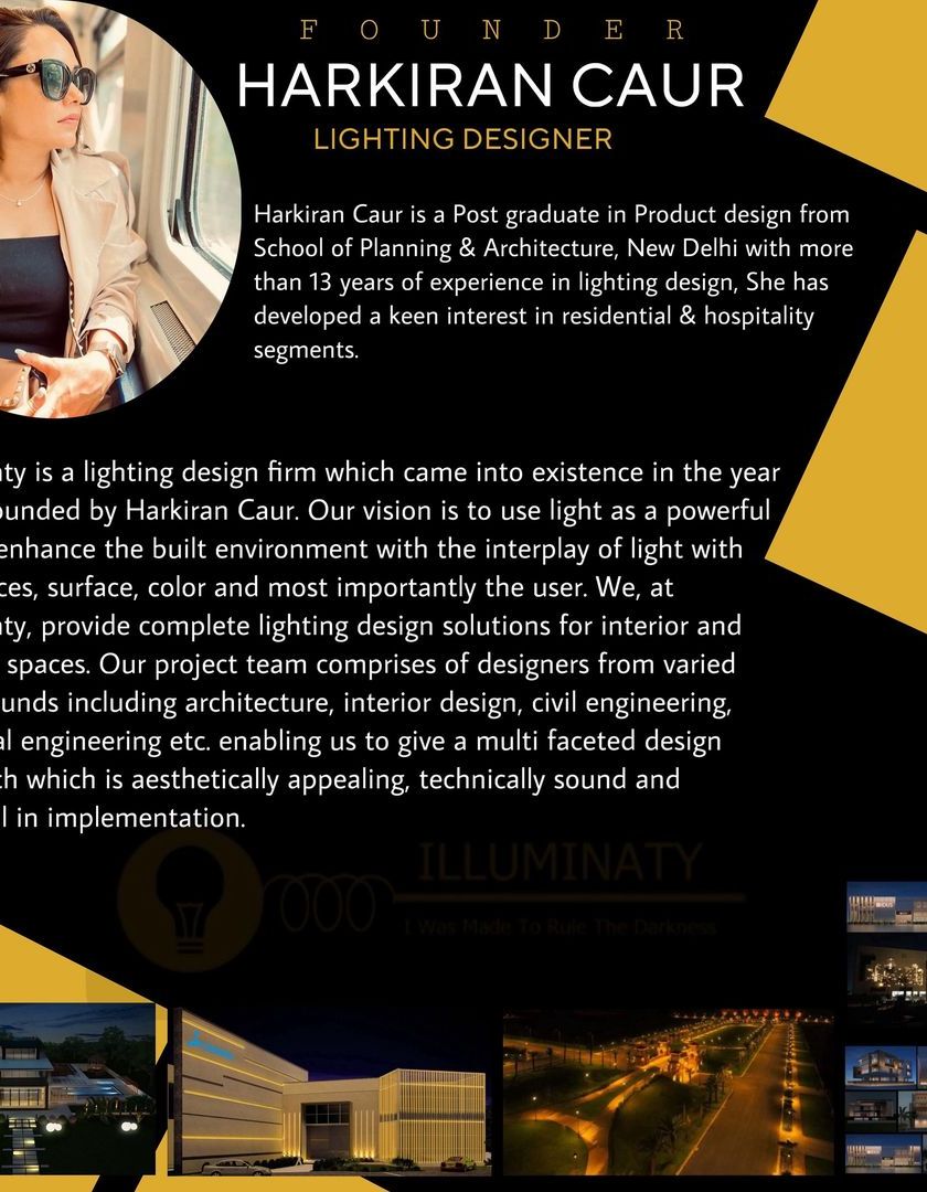 I am Harkiran Kaur, a lighting designer with over 13 years of experience in enhancing architecture through the power of light. My firm, Illuminaty, was founded in 2014 with a vision to use light as a powerful tool to transform spaces, guided by a team of designers, architects, and engineers.