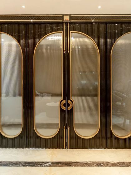 - Wall Cladding: Extensive use of fabric wall paneling (velvet/suede finishes), antique distressed mirrors, and metallic PVD coated stainless steel strips (Gold/Rose Gold/Brass).
