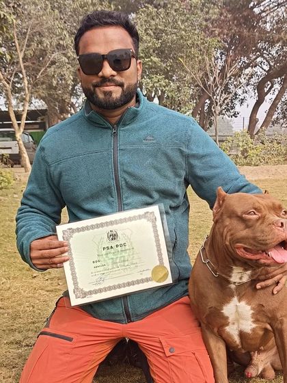Jai Mahakal! Dog training is my life, not just kaam (work). Certified trainer, PSA decoy, canine behaviourist—yeh sab meri journey ka part hai (all this is part of my journey). My boy Thor, American Pitbull, first in India to clear PSA PDC on suit. Bahut proud moment tha, excitement bhi thi, nervousness bhi (was proud, excited and nervous). I work with all dogs, not just big ones. Mishti, Papper—each dog teaches me something new. Modern training, every day is different.
