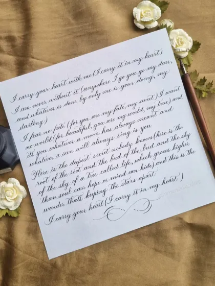I transform your most personal words, from long love letters and anniversary notes to wedding vows and cherished poems, into timeless keepsakes. Each letter is meticulously handwritten on your choice of paper with special inks, and can be finished with details like deckled edges or wax seals.