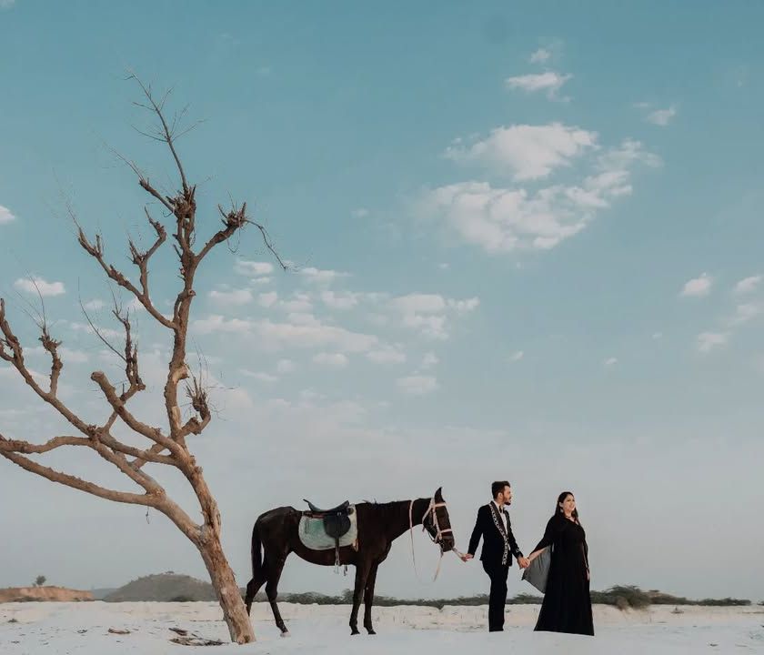 For the adventurous at heart, we create stunning visual stories in unconventional settings. This collection features dramatic shoots in the golden deserts of Rajasthan and the surreal, snow-like landscapes of Kishangarh, often incorporating elements like vintage cars, horses, and camels.