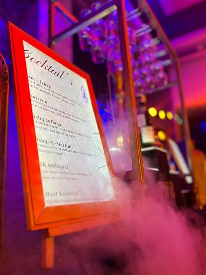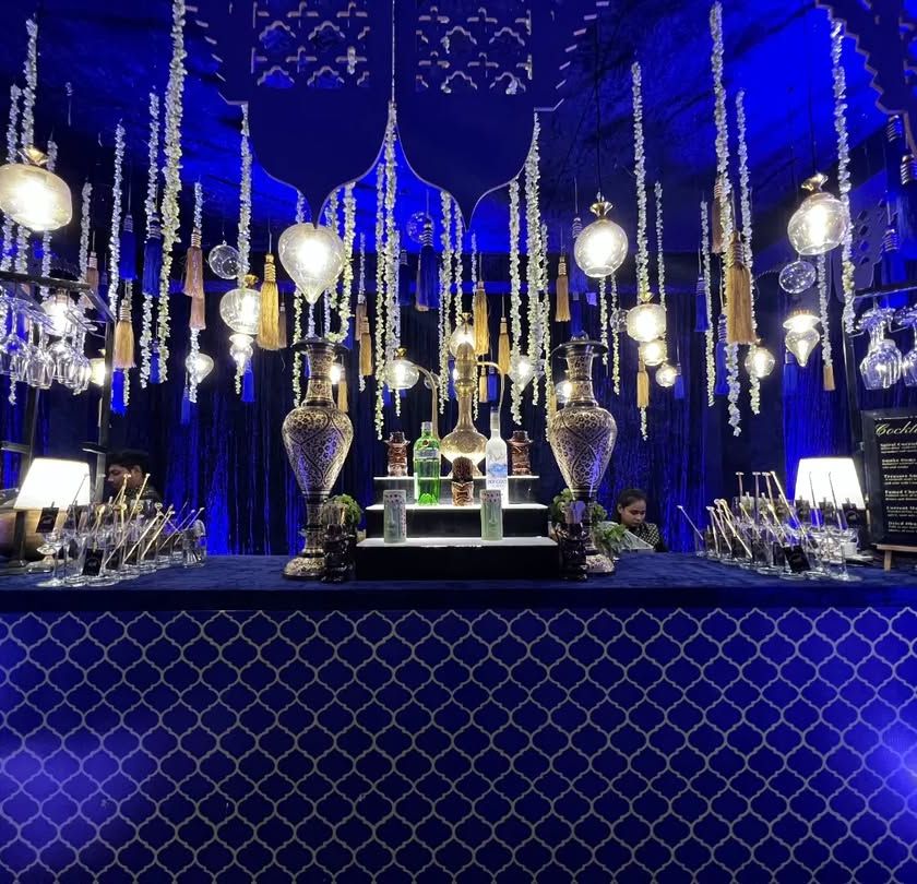 For a more soulful and elegant affair, we design Sufi-themed bars that create a mystical and enchanting atmosphere. These setups feature deep blue and gold color palettes, traditional decor like lanterns and brass vases, and custom cocktail menus with poetic names.