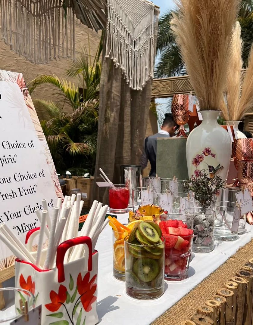 Perfect for daytime mehendis, haldis, or relaxed sundowner events, our bohemian-themed bars use natural textures and earthy elements. We incorporate materials like bamboo, macrame, and pampas grass, along with fresh decor like sunflowers and personalized coconuts for a laid-back, chic vibe.