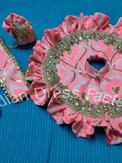 Stitching vastra for deities is a service I offer with great devotion. I create custom outfits for Laddu Gopal and Hanuman ji using beautiful brocade, mirror work, and sequins, ensuring each set includes everything from the dress to the pagdi.