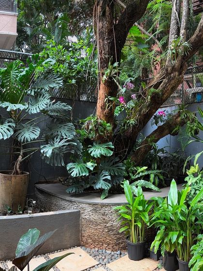 - 3-5 Large terracotta or FRP pots grouped to soften corners with plants like Areca Palms or Ferns.