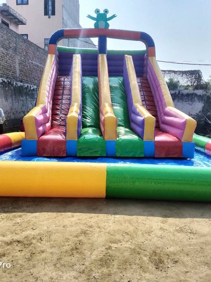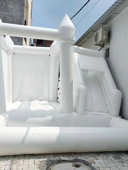 Namaste, this is J D Inflatables from Delhi. We make all kinds of bouncy castles and inflatable stuff - big slides, climbing walls, white bouncies for shaadi (wedding) parties, you name it. Photos say it all. We keep making new models, so if you want something special for your resort, amusement park, or event, just ping us. Size, colour, design - sab mil jayega (you’ll get everything).
