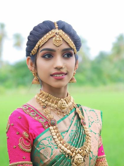 For your muhurtham or reception, we have a stunning collection of rental bridal sarees and lehengas. We offer everything from traditional pattu sarees with heavy aari work blouses to modern, glamorous lehengas for your big day.