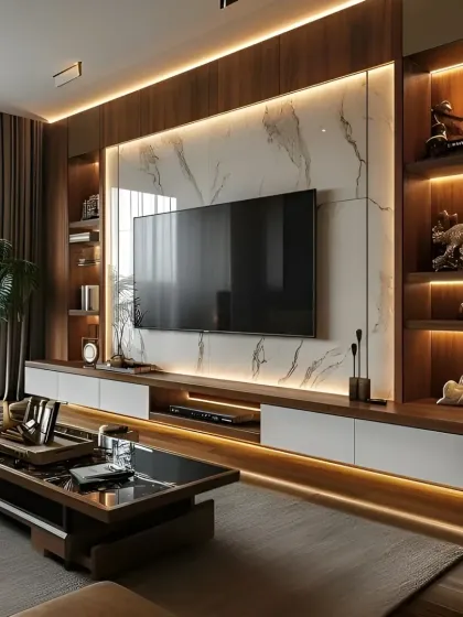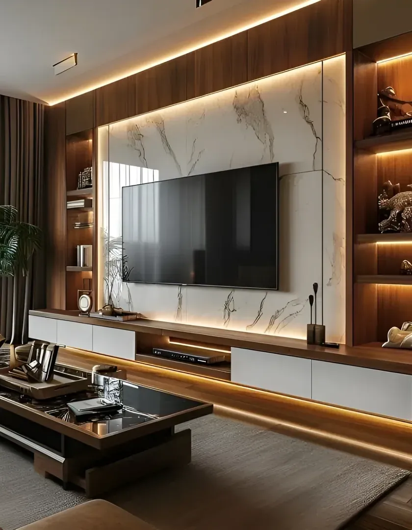 We create custom entertainment units that become the centerpiece of your living room. Our designs range from minimalist floating consoles to elaborate wall-to-wall systems, incorporating features like fluted wood or marble panels, integrated LED lighting, and a mix of open and closed storage to hide clutter and display your favorite items.