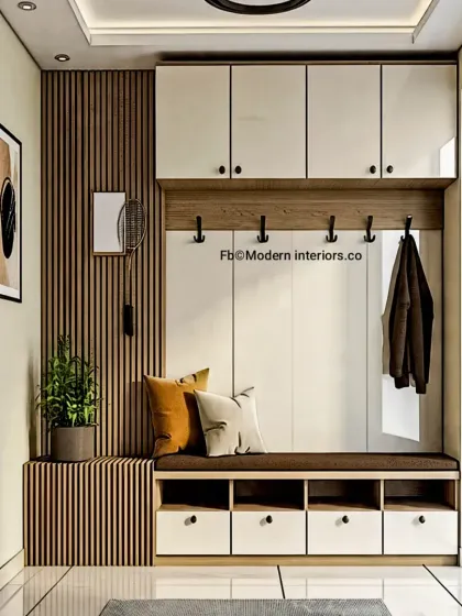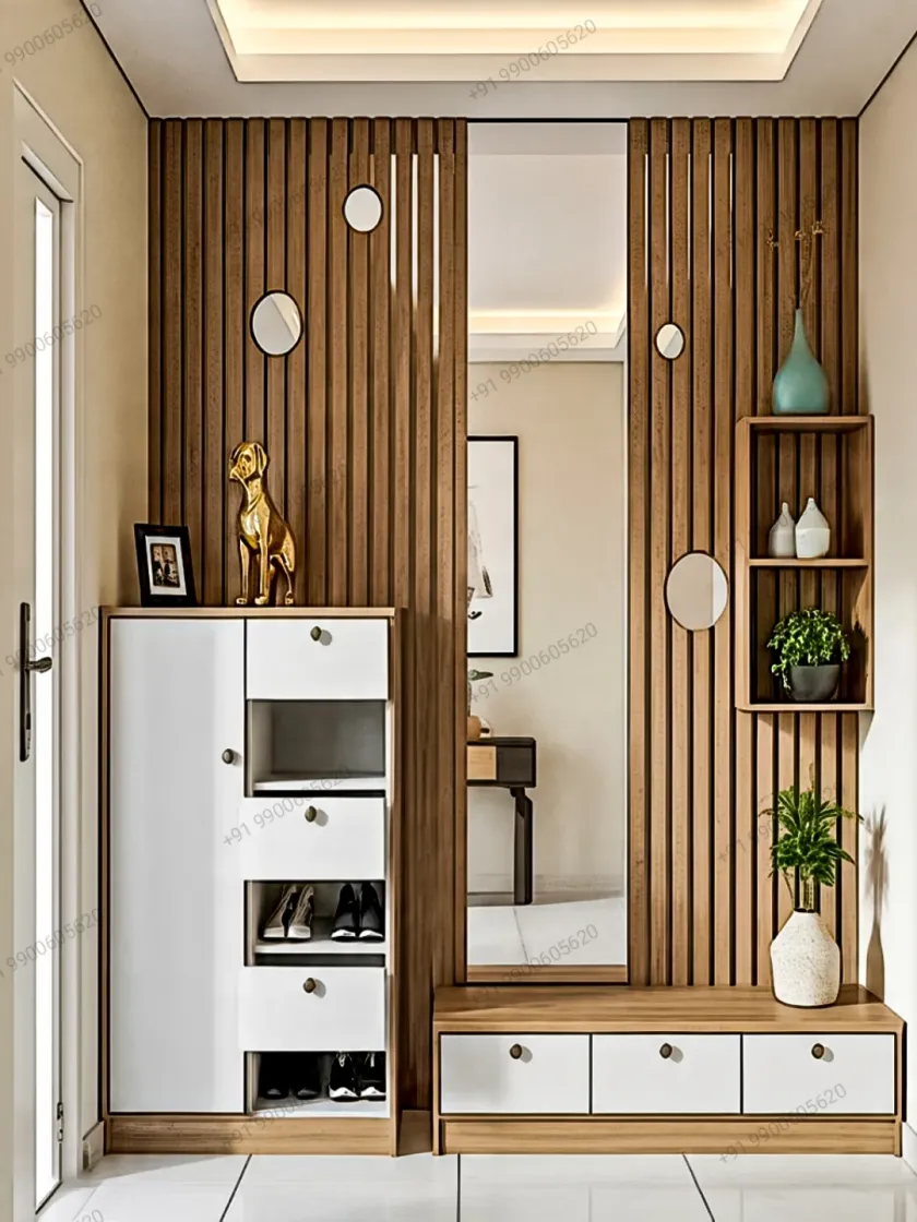 We design custom furniture to make your home's entrance both welcoming and clutter-free. Our solutions include integrated shoe cabinets with comfortable seating, coat hooks, overhead storage, and decorative partitions like wooden slats or louvered doors to create an organized and airy first impression.