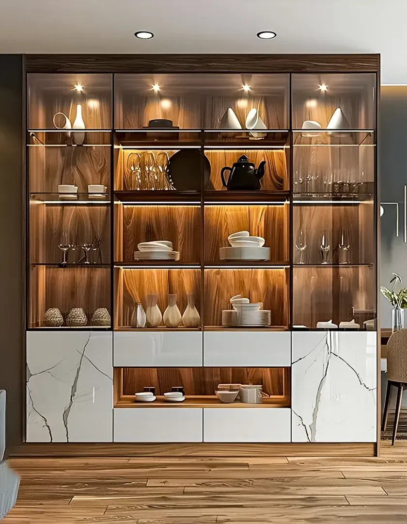 We design elegant storage for your dining and hosting needs. Our modern crockery cabinets showcase your glassware and dinner sets with features like backlit glass shelves and premium finishes. We also create custom bar sections or standalone units, perfectly integrated into your living or dining space.