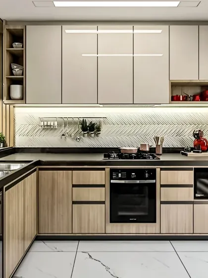 The L-shaped layout is one of our most requested designs due to its versatility and efficient use of corner space. It works beautifully in small and large kitchens alike, providing an excellent work triangle for cooking, cleaning, and storage.