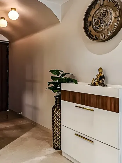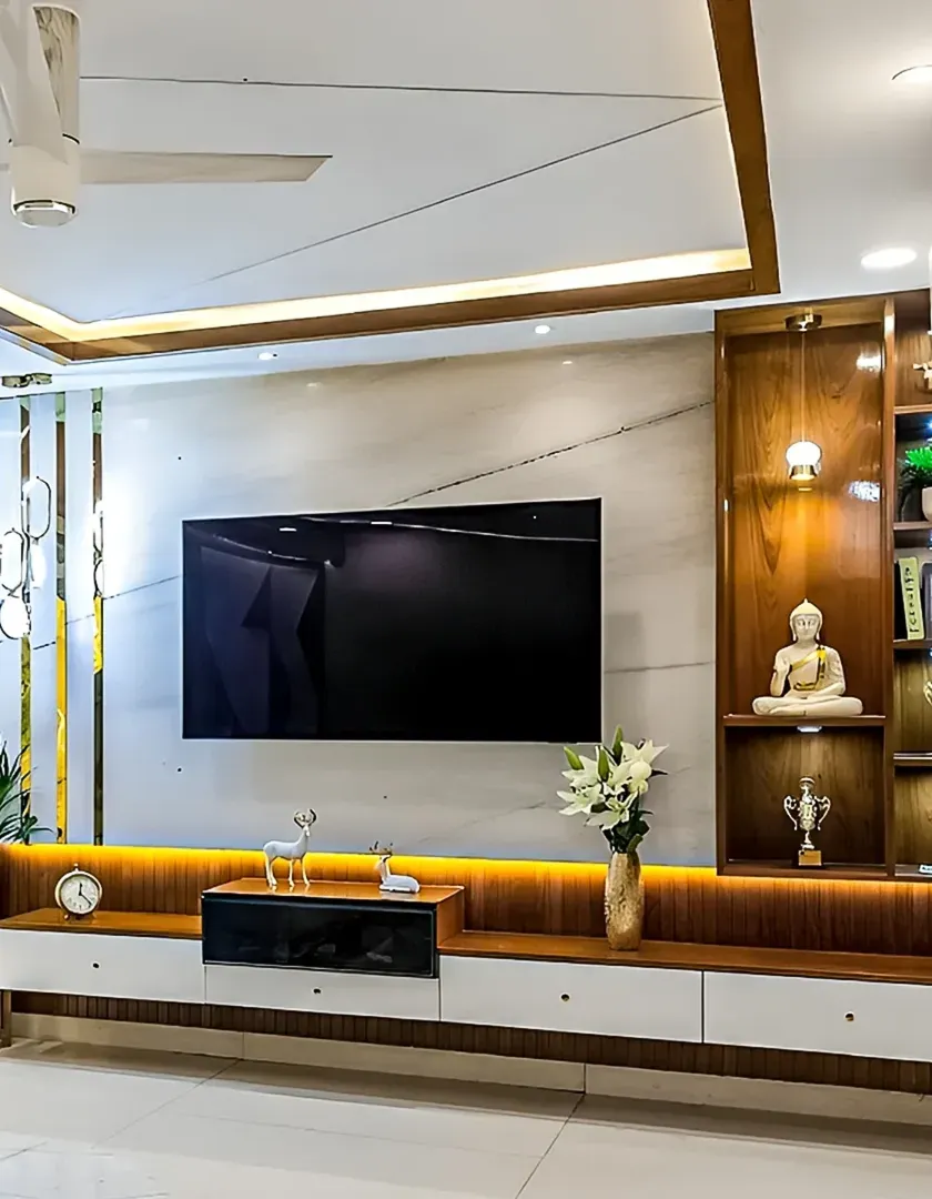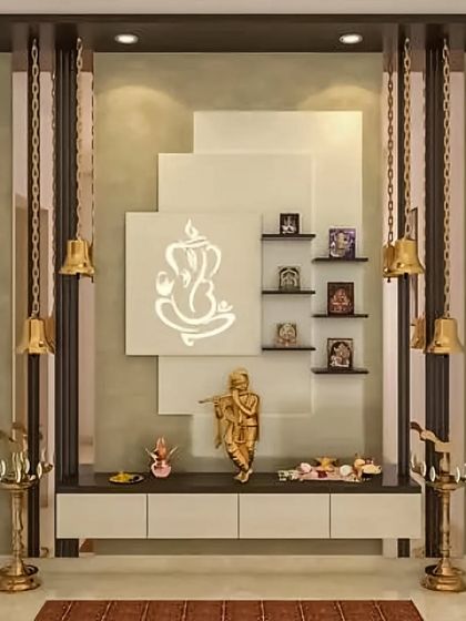 We design serene and beautiful pooja units that respect tradition while fitting into a modern home. Our designs range from intricate, traditionally carved wooden mandirs to contemporary units with backlit panels, hanging bells, and integrated storage for prayer essentials.