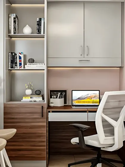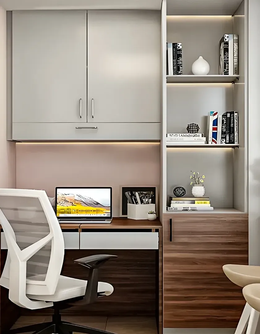 Whether you need a dedicated room or a compact corner, I design home offices and study nooks that are both ergonomic and inspiring. My designs focus on maximizing storage with overhead cabinets and providing a comfortable, well-lit workspace, including custom setups for gaming enthusiasts.