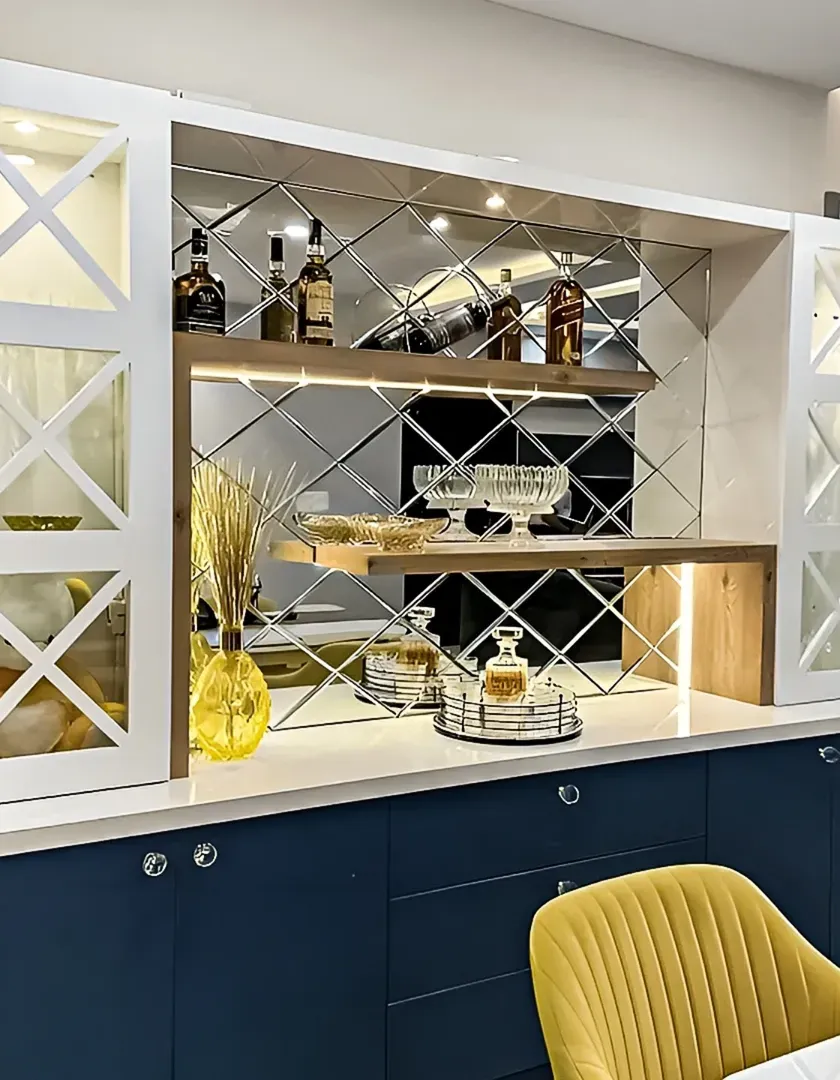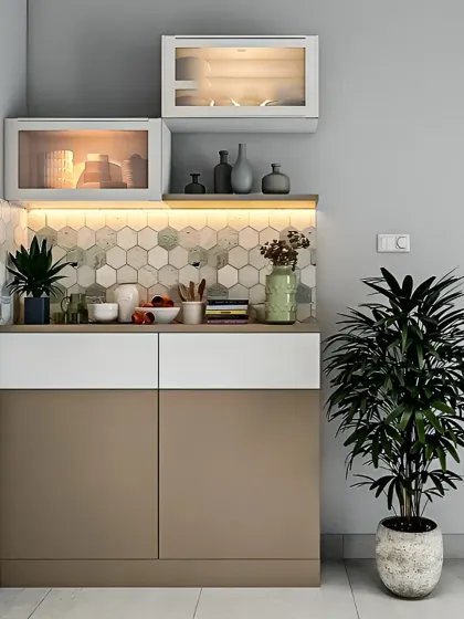I design bespoke storage furniture that is both practical and beautiful. This includes modern crockery cabinets, elegant bar units, space-saving shoe racks, and custom pooja mandirs that blend modern design with traditional elements.
