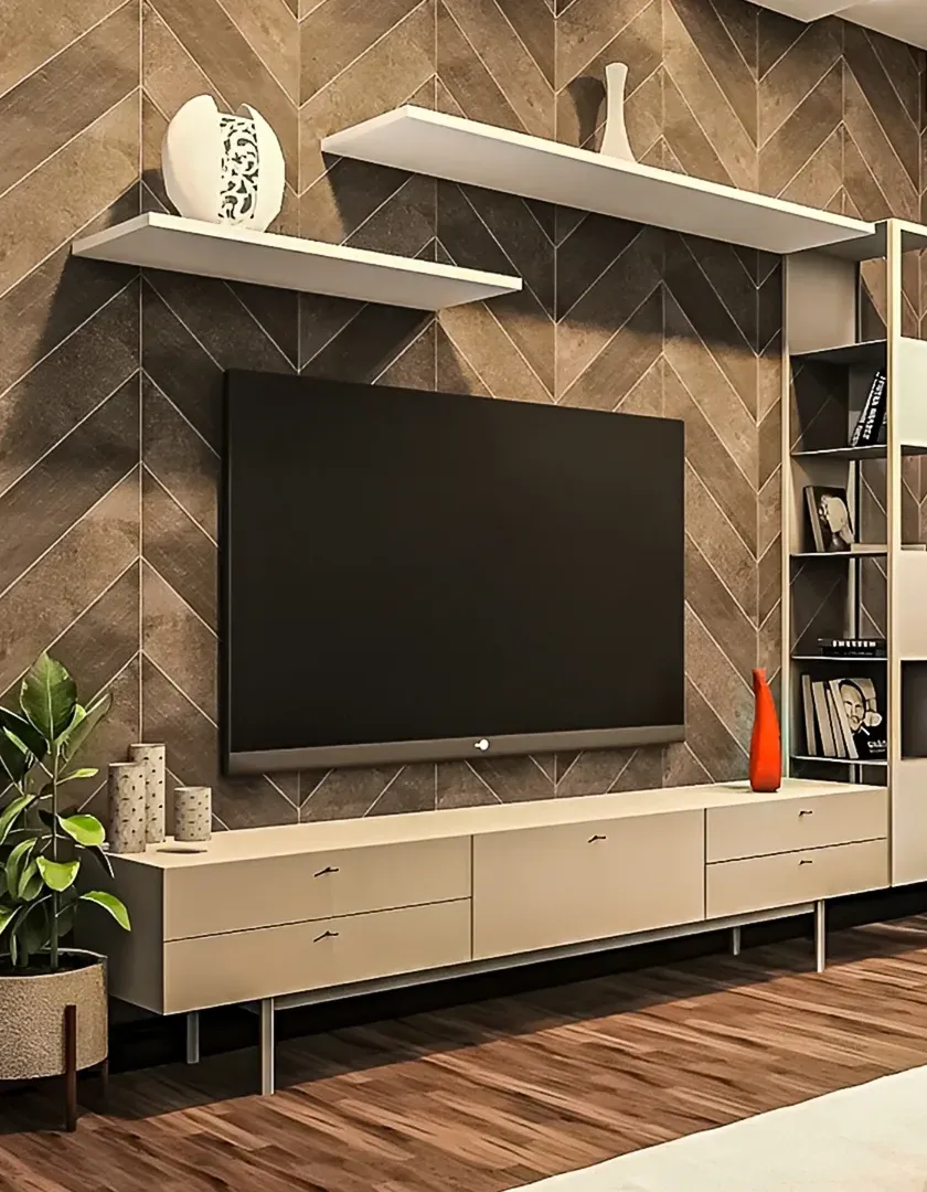 I create custom TV units and living room furniture that organize your media devices and serve as a stunning focal point. My designs range from minimalist floating consoles to large entertainment walls with integrated lighting, shelving, and partitions to divide spaces.