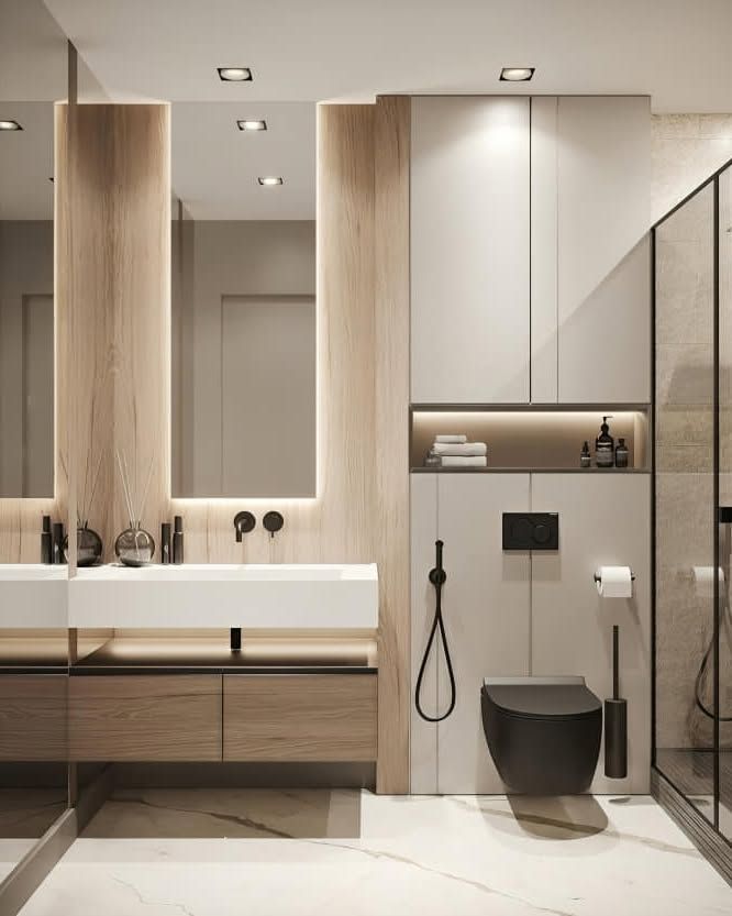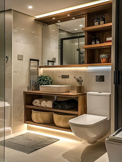 I transform bathrooms into spa-like sanctuaries with a focus on smart storage and easy-to-clean surfaces. I achieve this by mixing textures like wood and stone, and using statement lighting and modern fixtures to create a relaxing atmosphere.