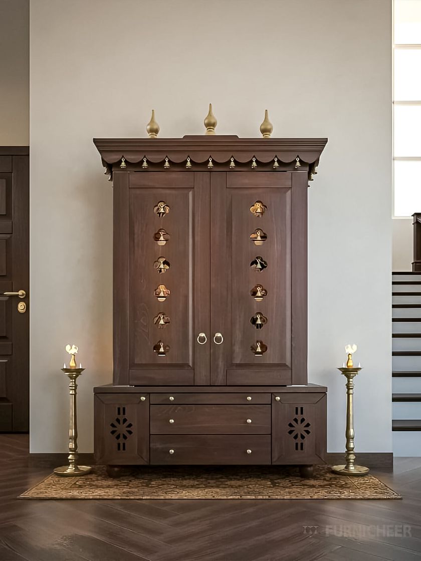 For those who love timeless elegance, we craft traditional pooja mandirs from rich, dark woods. These units feature intricate carvings, temple-style gopurams, brass bells, and ornate details to create an authentic, sacred atmosphere in your home.