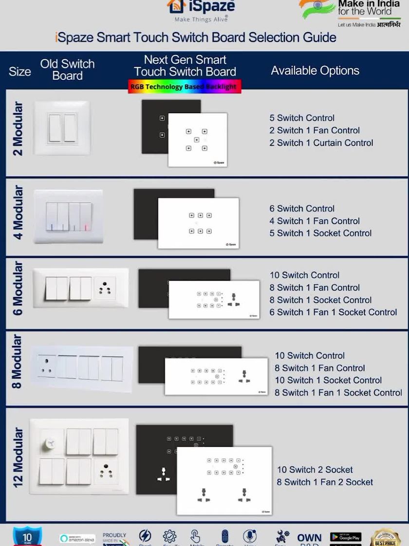 We have developed a complete range of smart touch switchboards that are 100% Made in India, from the PCB design to the software. Our switches fit standard Indian modular boxes and are available in various sizes, colors, and customizable finishes to match any home interior.