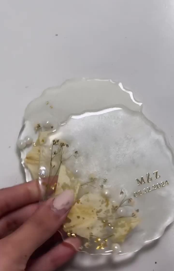 Your engagement is a once in a lifetime moment, and your ring platter should be just as special. I design custom resin platters in various shapes and sizes, personalizing them with your names, engagement date, and hashtags. We can create any theme you imagine, from floral designs to beach-inspired art.