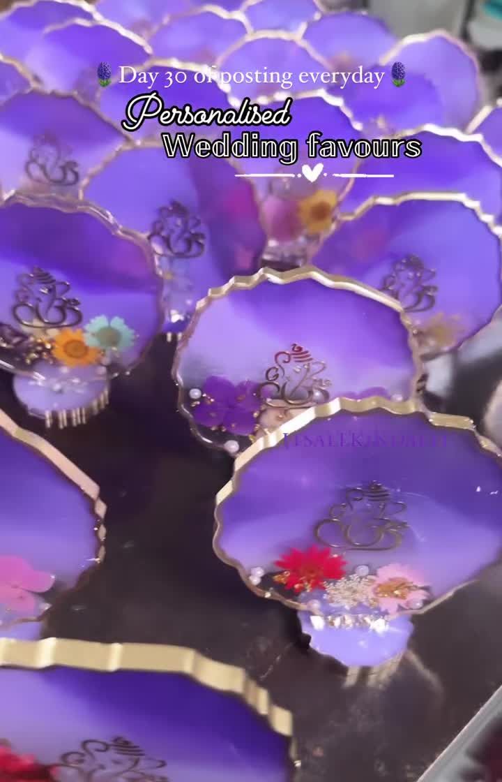 These are not your usual favors. I create these mini Ganesha idols on stands using resin, embedding them with dried flowers and gold details to match your event's theme. Each piece is fully customizable with colors and initials, making them a truly personal and blessed gift for weddings, housewarmings, or any celebration.