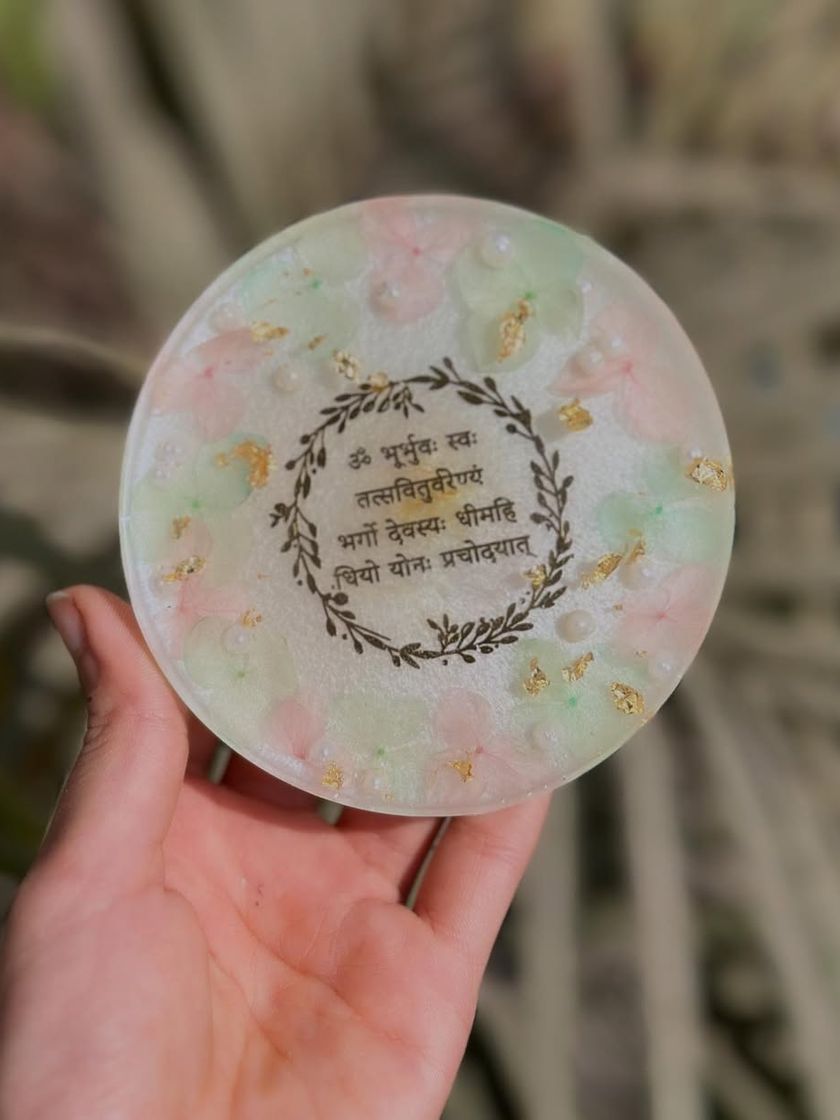 These are small pieces made with a lot of heart. I create resin coasters with spiritual mantras like the Gayatri Mantra, personalized bookmarks with preserved flowers, and other small gifts that carry a special message or feeling.