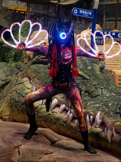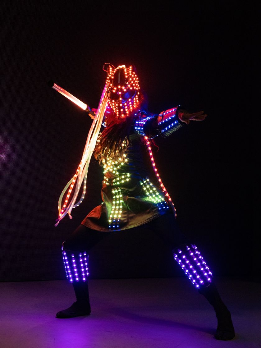 We create mesmerizing visual stories using cutting edge technology. This includes programmable pixel suits that display custom graphics, glowing alien-themed characters, and ethereal angels with vibrant LED wings.