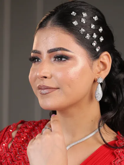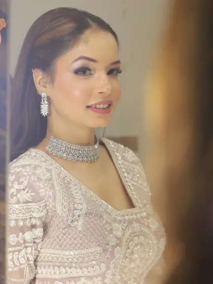 Hey, I’m Jaanvi. Makeup’s not just my kaam (work), it’s my ‘pehla pyaar’ (first love). Brides trust me, and that’s magic—nothing better. I’ve seen wedding madness—lehenga late, chai in hand, moms stressing. My job? Be the calm, make sure your makeup stays through tears and dance. Built my salon one brushstroke at a time. It’s not just a makeover, it’s you, feeling seen. Brides, bridesmaids, or just a pamper day—main hoon yahan (I’m here for you).