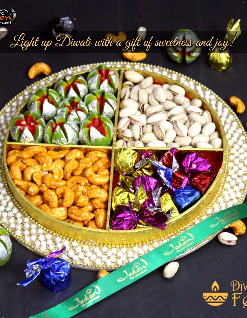 We create memorable Diwali gifts with a mix of traditional sweets, premium dry fruits, gourmet chocolates, and savory snacks. Our hampers come in various styles, from elegant trays to classic baskets, all beautifully packaged for the festival of lights.