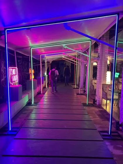 - Neon Structures: Custom metal truss walkthrough tunnel with neon flex lighting in brand colors.