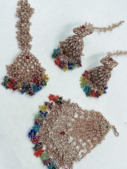 We rent out our own high-quality imitation bridal and party jewellery sets, customise colours to match your outfit, and deliver and pick up anywhere in India.
