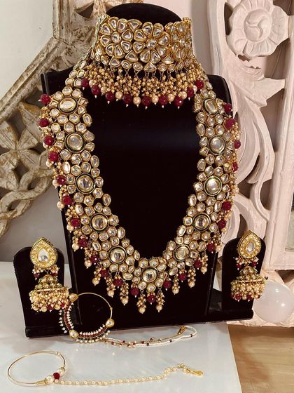 This is my specialty. I design and stock a wide range of complete bridal sets, from heavy Maharani haars to intricate polki and kundan designs. Each set is crafted to make you feel like royalty on your big day and can be customized to match your wedding attire.