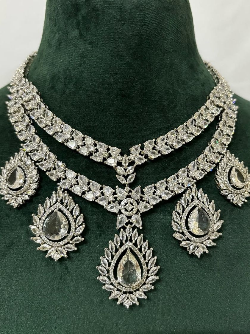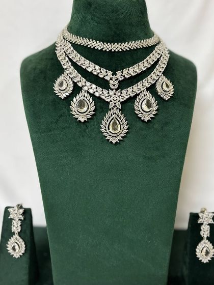 My collection of modern American diamond (AD) imitation jewellery. These silver-toned sets are perfect for receptions, cocktail parties, or any event where you want to add some sparkle. All sets are available for rent.