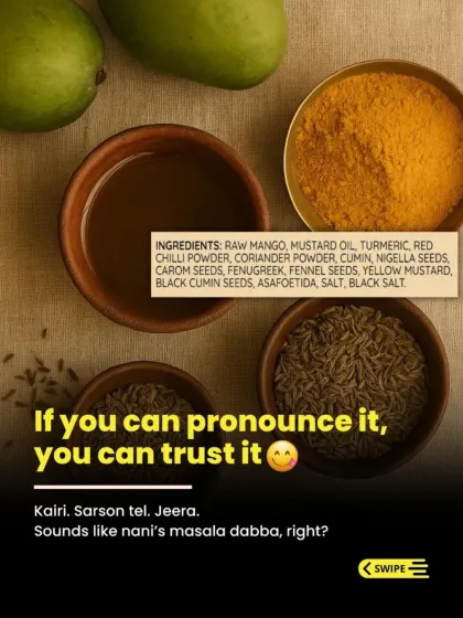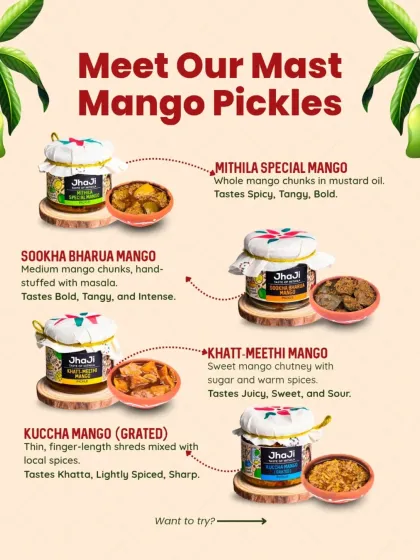 Seasonal Ingredients, Local Flavours - Kalkatiya mango pickle Darbhanga ka hai, sab kuch Bihar ki mitti se. Taste aata hai nature ke rhythm se, cold storage se nahi.